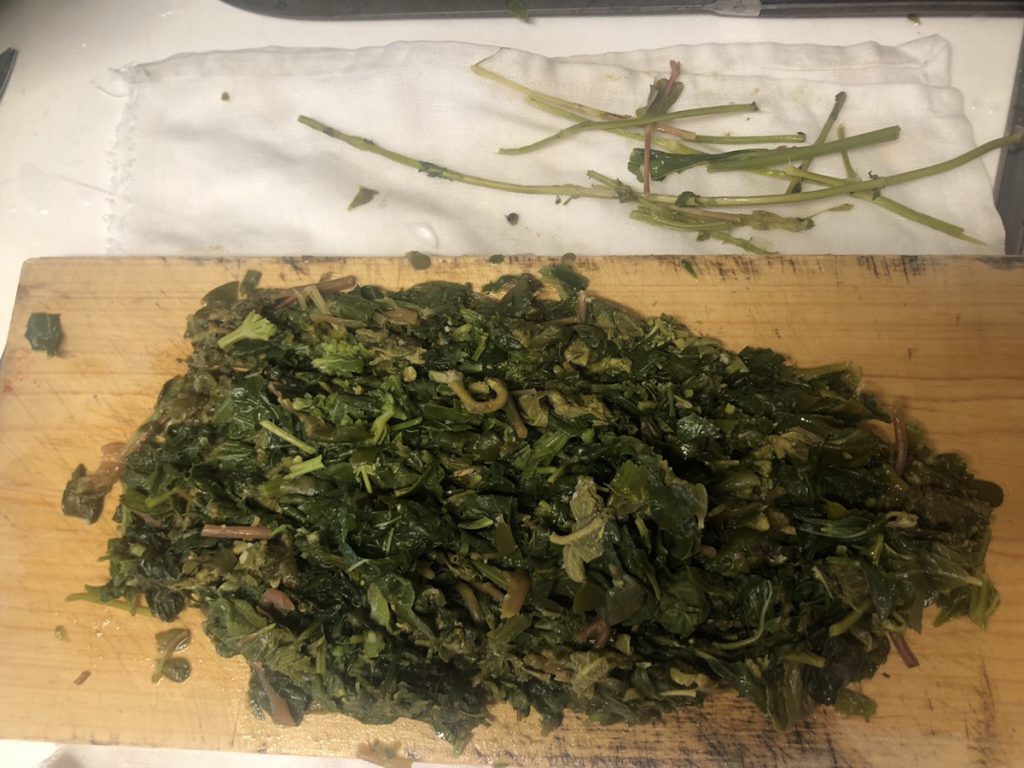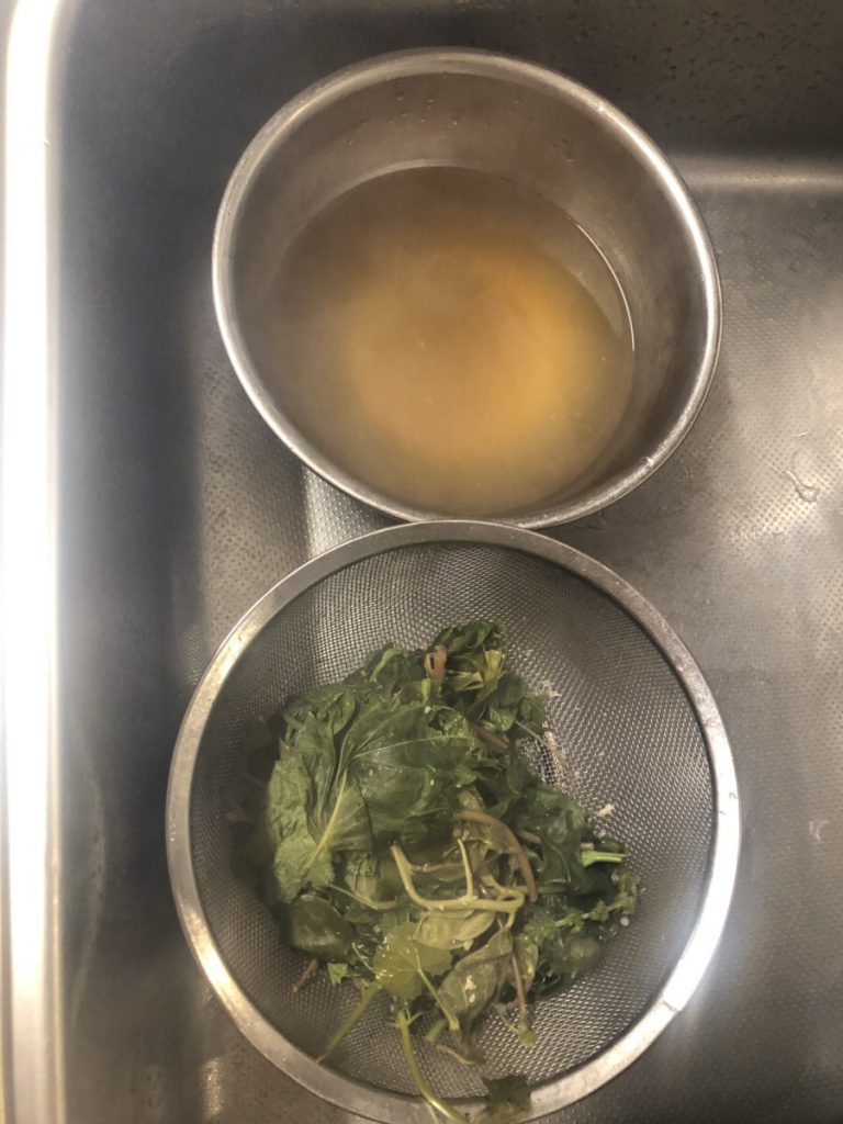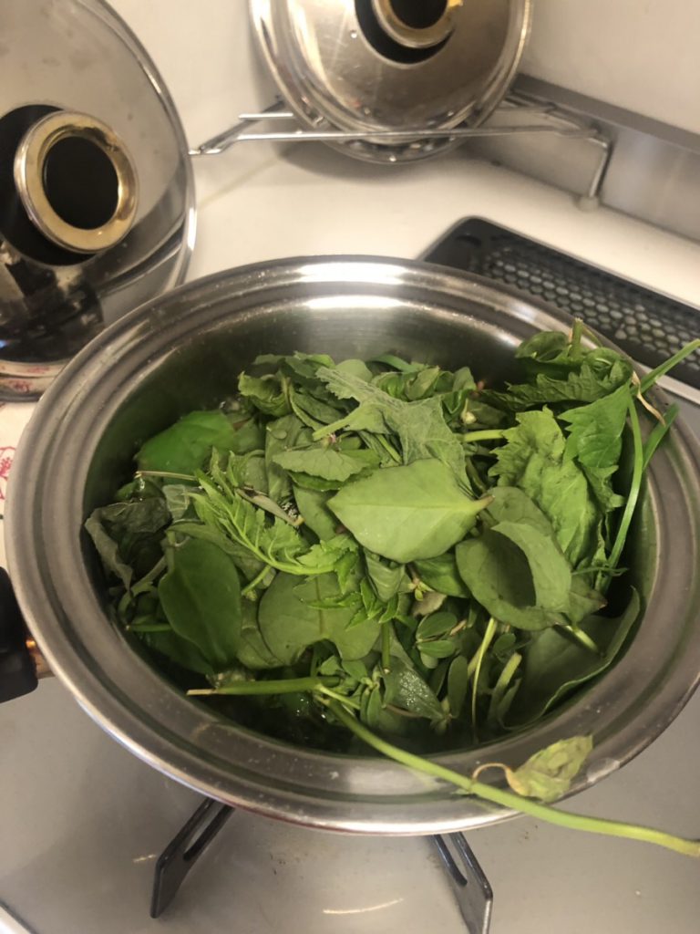②野草を茹でる。茹で汁は水分調節するのに残しておく。
