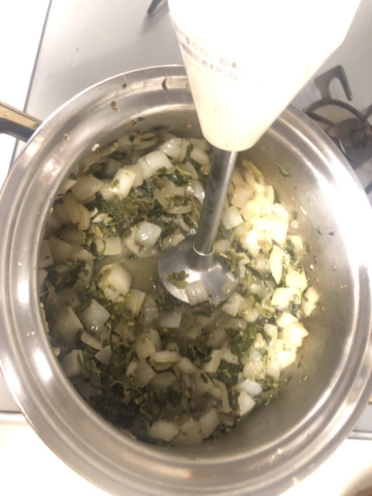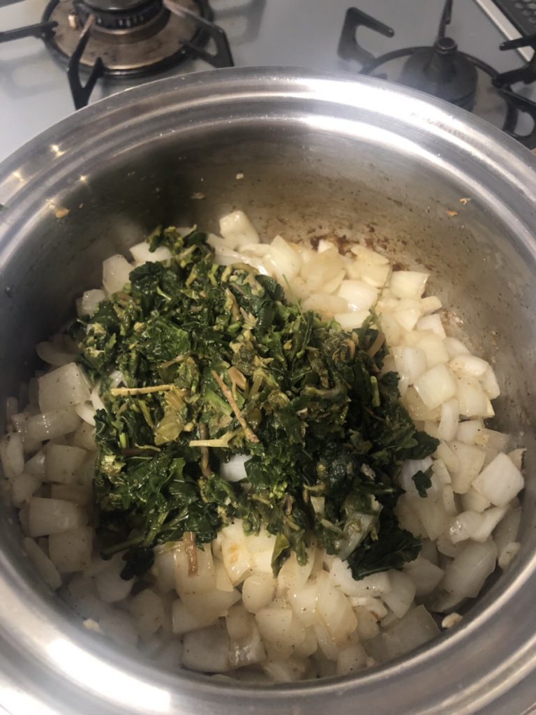 ③玉ねぎが透明になったら、塩を入れ、さらにトロリとなるまで炒める。あく抜きした野草を入れて炒める。