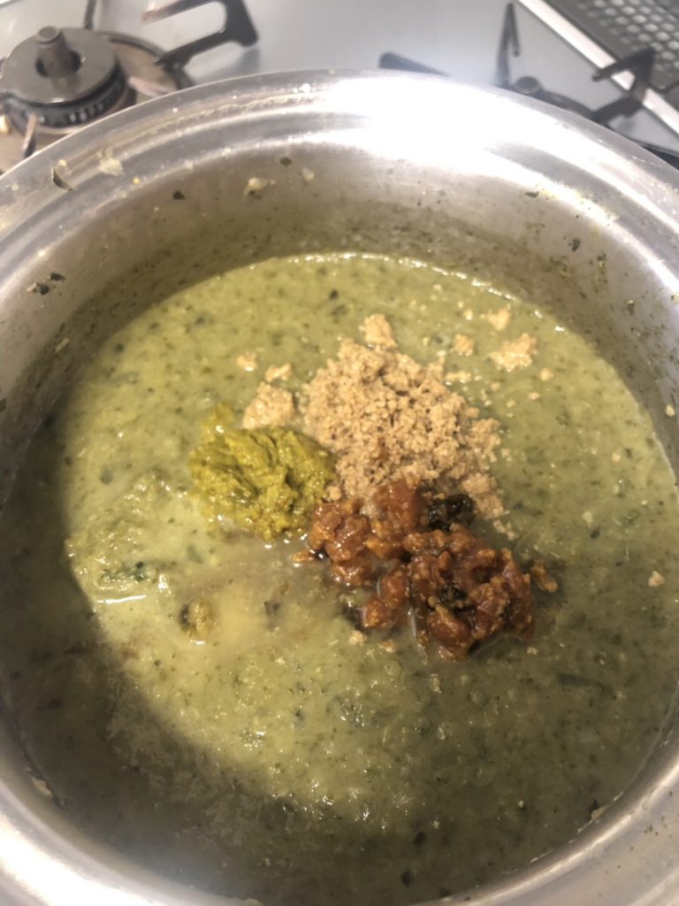 ⑥野草ダシで水分調整し、味付けAを入れて濃いめに味付けする。